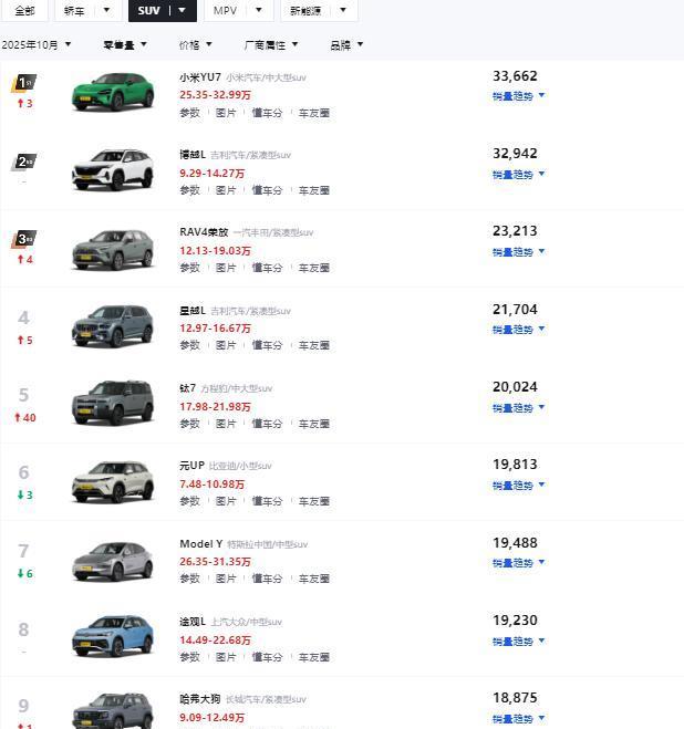 在10月的SUV销量竞赛中,最大的黑马当属小米YU7。这款车型凭借33662辆的销售成绩首次登顶月度销量冠军。整车凭借前卫动感的设计、3秒级的加速性能以及800km续航+800V快充技术,成功吸引了大量年轻消费者。不过,目前这款车也面临着交付周期过长的挑战,这在一定程度上可能会影响后续的市场表现。